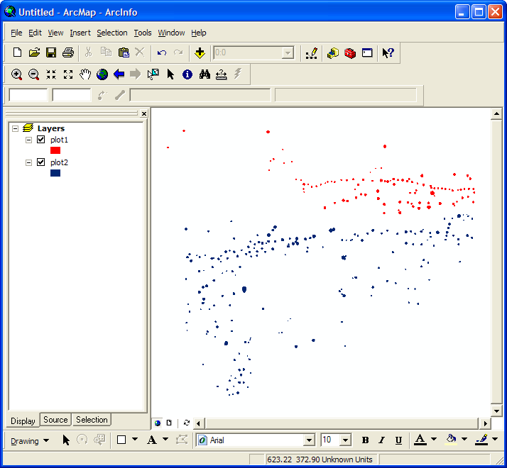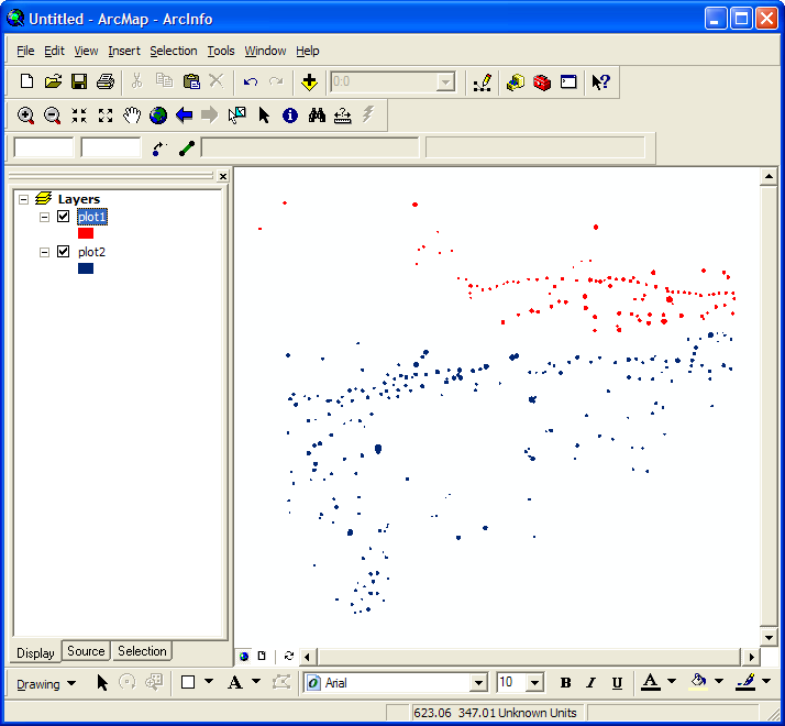 First, let's look at the ArcGIS ArcMap program. Here we have the program, already booted up with our favorite plots (as well as the toolbar):