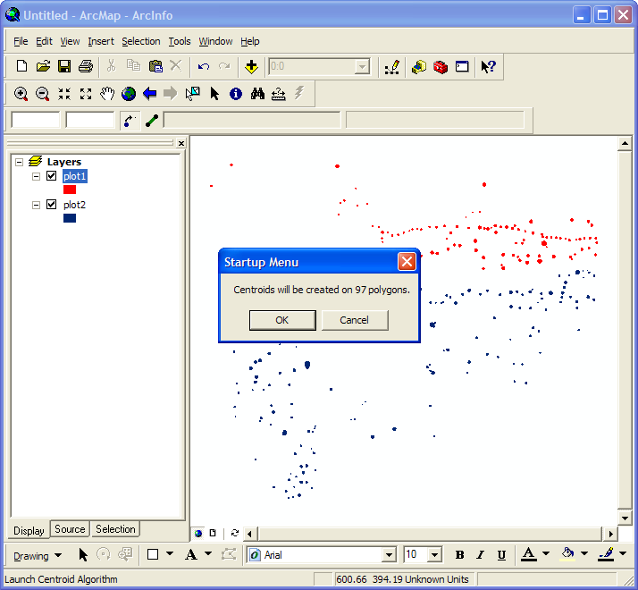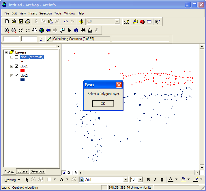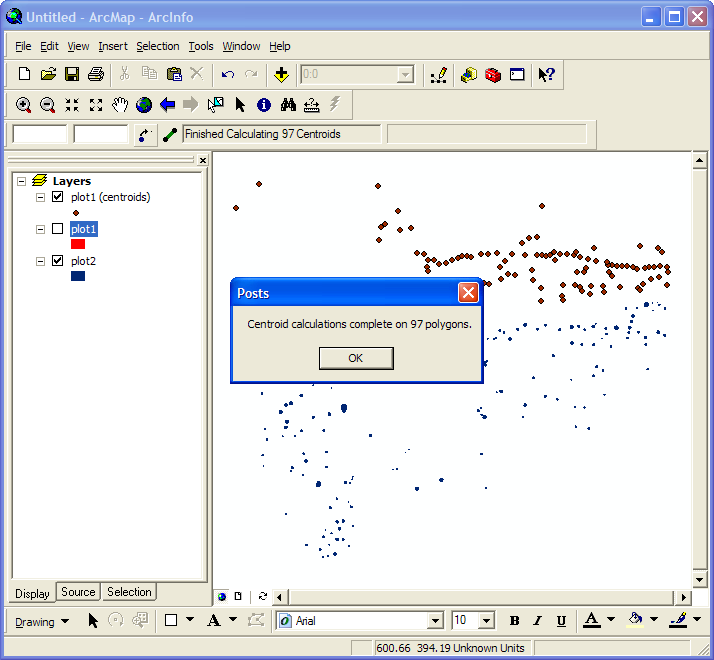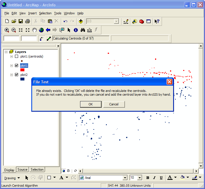 Starting the calculations is as simple as clicking the little centroid button. The toolbar then pops up a window to let you know the number of postholes(polygons) which will have their centroids calculated. This allows you to cancel out if you change your mind about wanting to press that button, for any reason (keep in mind that it takes roughly one minute to calculate every 200 centroids, and that you cannot do anything else in ArcGIS while these centroids are being calculated):
