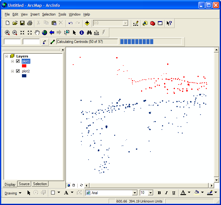 Once you continue, the progress bar will come alive! It will update every 25 centroids calculated, giving you accurate numerical and graphical information concerning the progress of your centroidizations. At this point, it is crucial to understand that ArcGIS is busy, hence you will not be able to do anything else in the program. It must sit and think until it is complete: