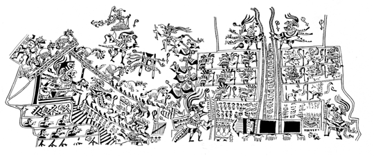 This drawing (Donnan and McClelland 1979:30 shows the conch shell transfer. Click here for a closeup view of this scene (144 KB).