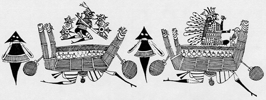 This drawing (closeup) from painted designs on a stirrup spout bottle shows Moche elites riding tule reed boats (Donnan 1978:104).