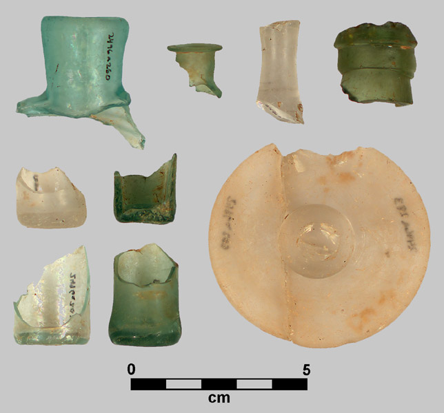 Glass bottle, vial, and stemware fragments from Feature 1 at the Bowers site.