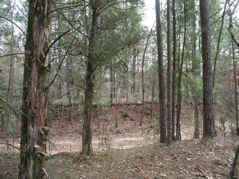 The Bowers site is bisected by this old road bed. The cabin cellar (Feature 1) is located just beyond the far road bank. The site was first identified in 1970 by the occurrence of Catawba pottery fragments along both banks of the road.