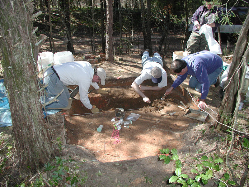 Brett Riggs, Andrew Demas, and Lloyd Richter (left to right) are excavating the west half of Feature 1, a rectangular cellar pit. Michelle Schohn is preparing bags of fill dirt for transport back to Chapel Hill for processing.
