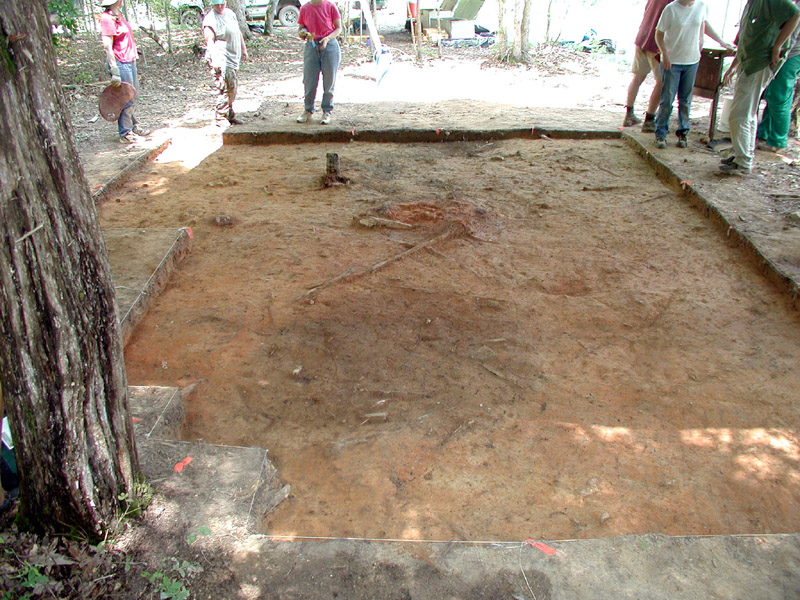 View (to north) of the Locus #2 excavation block after troweling at top of subsoil. The dark stain in the foreground is the top of Feature 1, a cabin cellar pit. At the center of the excavation is Feature 2, the base of the cabin's stick-and-clay chimney.