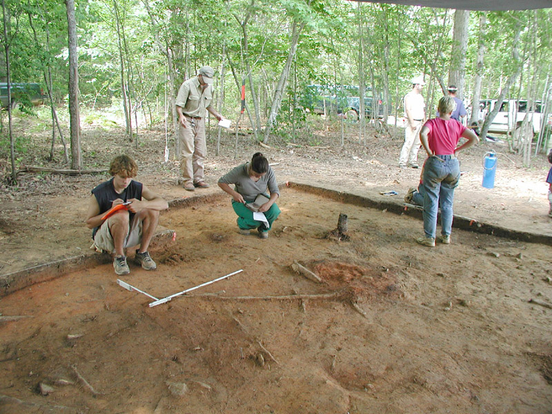 Chris Umphlett (at left) is mapping a one-by-one-meter unit adjacent to Feature 1. Morgan Dupuis is recording soil color.