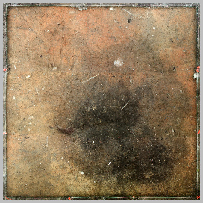 This is a mosaic view of the excavation block at Locus #3 that contained Feature 5, a large pit that appears to have been dug to obtain clay for daubing houses. It was created by taking vertical photographs of each of the nine one-by-one-meter excavation units and piecing them together. The top of Feature 5 is represented by the large, dark circular area.