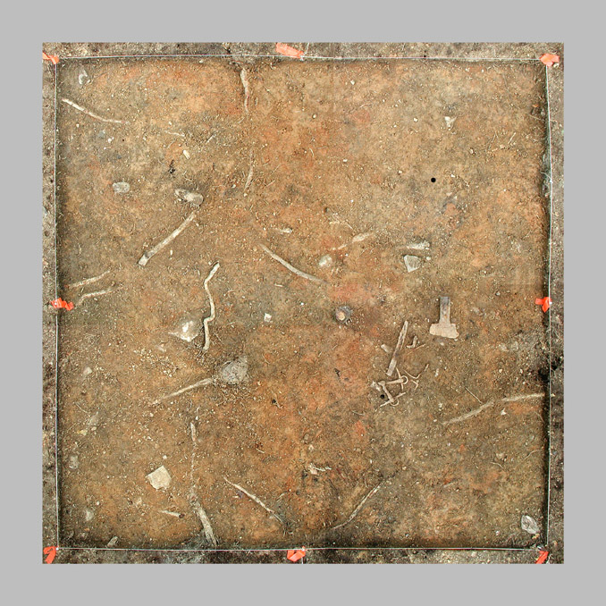 This is a mosaic view of the excavation block at Locus #3 that exposed the cluster of metal artifacts, including a flintlock pistol, snaffle bits, and a worn-out shovel blade (see southeast quadrant; north is at top). It was created by taking vertical photographs of each of the four one-by-one-meter excavation units and piecing them together.