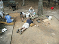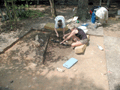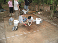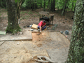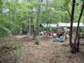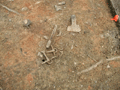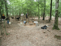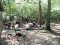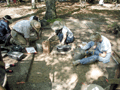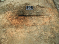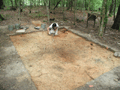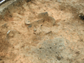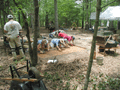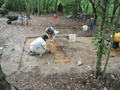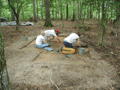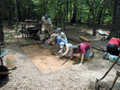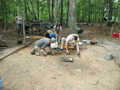 Excavations at Catawba New Town, Locus #3 The 2003 UNC Archaeological Field School excavated at Catawba New Town, Locus #3, from June 5th until June 20th. The area excavated represents the location of one or more Catawba log cabins that were occupied during the early 1800s, and these are thought to be contemporary with the cabin found at Locus #2. A brief summary of what we found here is provided below. The excavations were directed by RLA staff archaeologists Steve Davis and Brett Riggs, with supervisory assistance from UNC graduate students Michelle Schohn and Jon Marcoux, and UNC undergraduate student Rebecca Richman. Twelve UNC students participated in the excavation. The pictures below give a glimpse of our experience at Catawba New Town, Locus #3. Click on any thumbnail image below to view a larger picture. Maps and digital mosaics of the 2003 excavations. Excavation Summary Excavations at Catawba New Town (RLA-SoC 632) were undertaken at two cabin locations, designated Loci #2 and #3. Locus #3, located about 70 m from Locus #2, represents one of the two cabin locations identified to date that has never been plowed. Excavations of four separate blocks encountered substantial concentrations of artifacts and the tops of pit just beneath the leaf litter and root mat. Given this state of preservation, excavation was undertaken in 50-cm quarters within each one-by-one-meter square and the excavators worked largely with trowels. Metal artifacts at Locus #3 had been mapped previously by metal-detector survey, but very few of these artifacts have been recovered. Mapped concentrations of artifacts helped guide the selection of areas to excavate. The largest excavation block contained 30 one-by-one-meter squares and revealed four features. One of these (Feature 5) is a large, somewhat irregular-shaped basin that contained large quantities of Catawba pottery (mostly small sherds) and other artifacts. This feature likely represents a pit that was dug to retrieve clay for daubing. The other three features (Features 4, 6, and 7) were roughly rectangular pits that contained relatively rich deposits of artifacts. Features 4 and 6 may represent shallow cellar pits. All three features contained fragments of broken Catawba vessels and pearlware and Rockingham ware sherds, as well as glasswares, tableknives, and silver bangles; Feature 6 also yielded a small, unbroken Catawba-made bottle and a simple Catawba cup. Another excavation block, located nearby and comprised of 12 one-by-one-meter squares, revealed the base of a stick-and-clay chimney (Feature 8) and a filled-in stump hole (Feature 9) that contained large sections of two broken Catawba vessels. The chimney base was covered with a thin deposit of charcoal, ash, and burned pearlware sherds that appears to represent in situ hearth debris. Two smaller areas were excavated at the edge of Locus 3. The first, comprised of 4.75 one-by-one-meter squares, yielded numerous, highly fired Catawba sherds from a thin deposit just beneath the root mat. Interestingly, few of these sherds had been smudged and did not appear to have come from fully completed vessels. If this interpretation holds up following analysis, then this area may represent a waster dump. A significant aspect of Catawba economy in the early nineteenth century was the commercial production of pottery for sale to their white neighbors and other markets. This intensification of production is generally reflected by the uniformity and apparent large quantity of pottery found at New Town. The final excavation block, comprised of four one-by-one-meter squares, was placed where a cluster of metal artifacts had been found during the metal-detector survey. Initial testing of this location had yielded two articulating halves of a snaffle bit, an unidentified iron object, and a lockplate from a flintlock pistol. This area apparently was a trash dump, and excavations revealed another complete snaffle bit, a harness buckle, a pistol barrel and frizzen, a worn-out shovel blade, and another unidentified iron object. This deposit, located 35-40 m southwest of the residential clusters, represents a discrete, off-site dump. Soil samples recovered at one-meter intervals across Locus 3 will be used to define variation in residual soil chemistry, with the goal of determining chemical signatures of cultural activities around and between cabin areas. Such chemical patterns will be referenced to structures of contextual patterns and artifact distributions to reconstruct spatial aspects of daily activities at New Town.