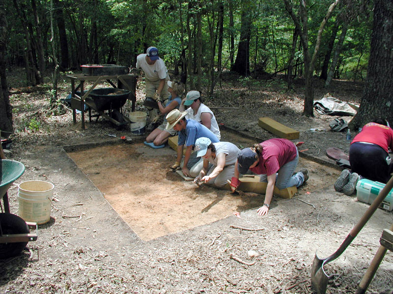We have excavated to top of subsoil the nine one-by-one-meter units covering Feature 5, and the students are cleaning the excavated surface for photography and mapping.