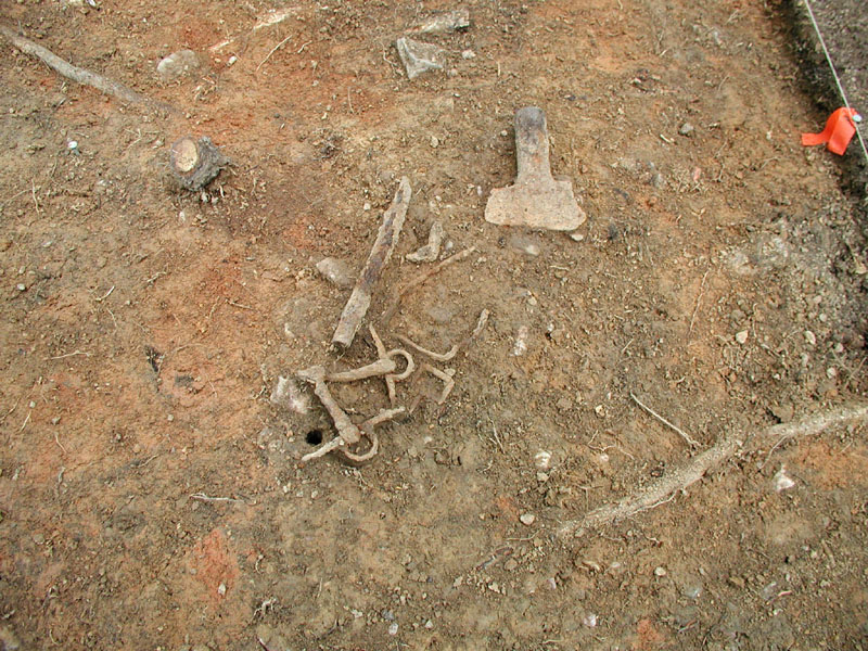 This is a refuse deposit found just below the humus at the southwestern edge of Locus #3. When initially discovered in spring, 2003, a pistol gunlock, two halves of a snaffle bit, a harness buckle, and part of a doorlock were removed. The remaining artifacts, seen here in situ, include a pistol barrel (top left), a pistol frizzen (just right of barrel), a worn out shovel blade (top right), an articulated snaffle bit (bottom), a buckle (just right of snaffle bit), and a bent iron rod (to right of barrel).