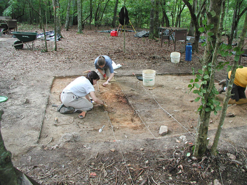 Dara Slivka (left) and Rebecca Richman (right) are removing soil and ash deposits from the top of Feature 8, a stick-and-clay chimney base.