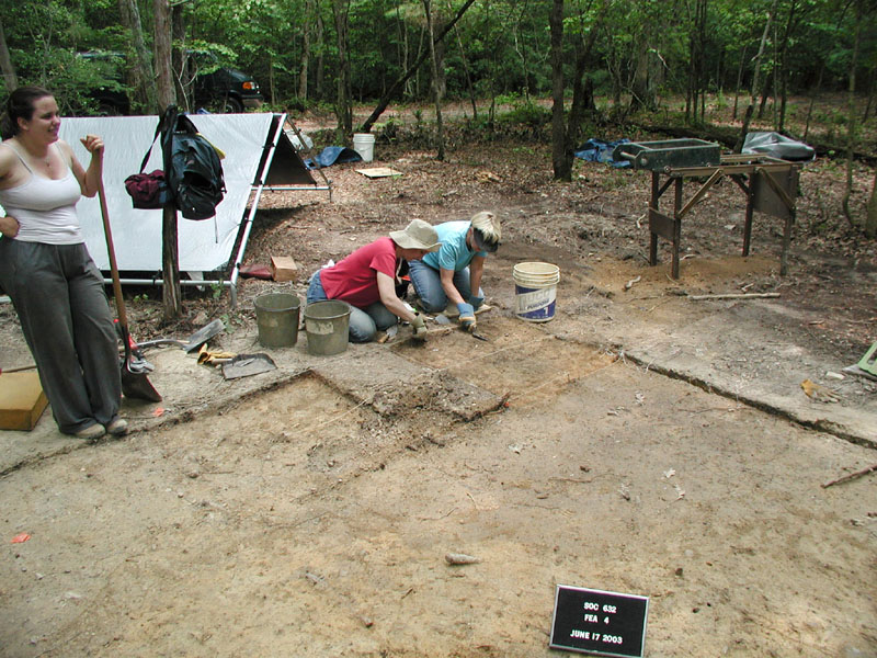 Ellen Sedman and Charlene Brummitt are removing humus from an excavation unit while Morgan Dupuis enjoys a short break.