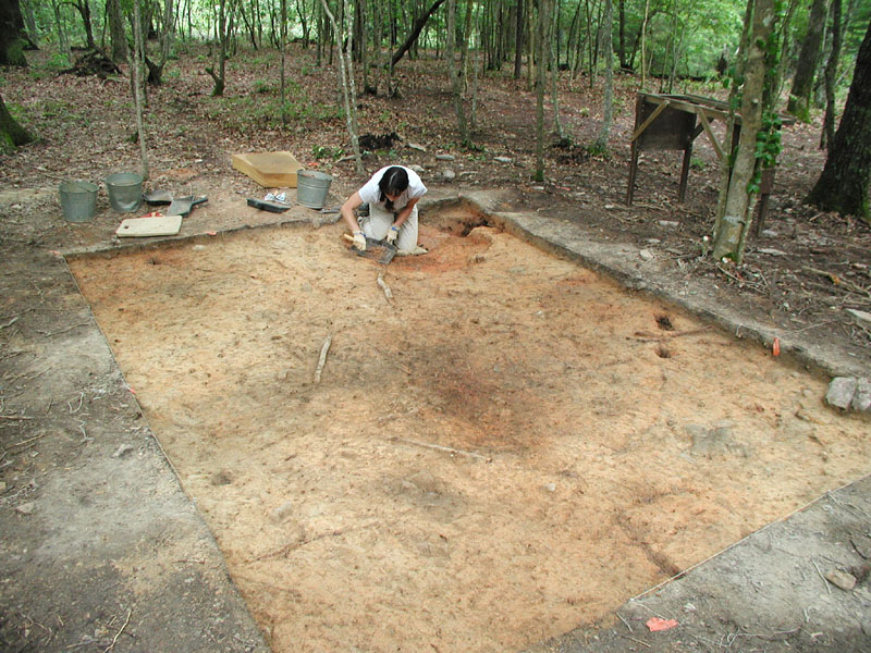 Dara Slivka is just finishing troweling the Feature 8 excavation block. The dark, reddish area in the center of the excavation is Feature 8. Dara is working in Feature 9, an excavated shallow stump hole.