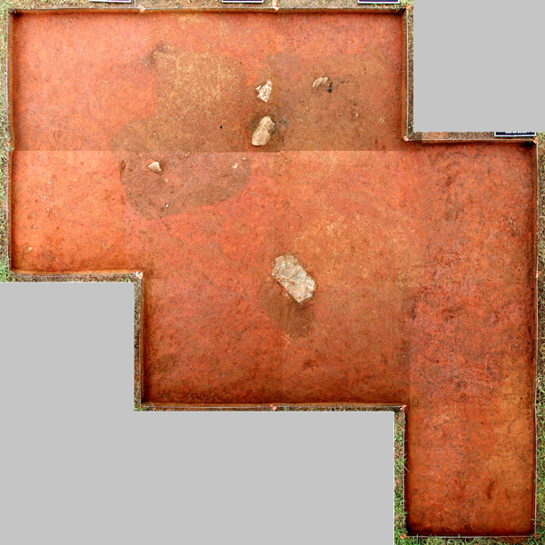 This is a mosaic view of a four-by-four-meter block containing Features 4, 5, 6, and 7 (north is at top). It was created by taking vertical photographs of each of the 11 one-by-one-meter excavation units and piecing them together. All four pits were barely visible at the top-of-subsoil surface. They were numbered in clockwise fashion, starting with Feature 4, a large circular pit with a large rectangular rock at the top (bottom right). Just northwest of Feature 4 is a disturbance that was interpreted as two overlapping rectangular pit (Features 5 and 6). Both were relatively shallow and contained very few artifacts. To the east of these features was a large, rectangular cellar pit (Feature 7) with three large rocks at the top. While only faintly visible at the top-of-subsoil surface, it was filled with relatively rich deposits of soil and artifacts, including an iron hoe, the base of a large case bottle, and numerous fragments of Catawba-made pots. As with Feature 2, it is believed to date to the 1770s.