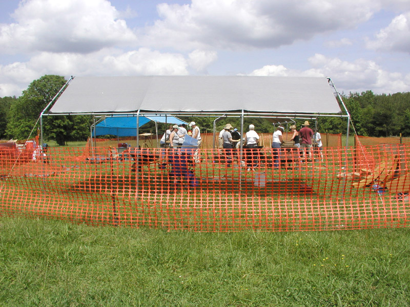 This is the first day of excavation at Catawba Old Town. Students are learning how to dig and sift. The shelters over the excavations protect the excavated areas, and the students, from heat and rain. The orange fencing was erected to keep cattle out of the work area. It was only partially successful!