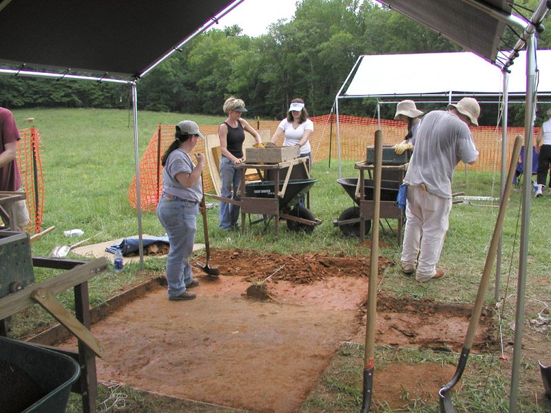 Students have begun removing the plowed soil with shovels. They are excavating in one-meter square units and screening the soil through 1/4-inch mesh. This excavation exposed the tops of a rectangular cellar pit (Feature 2) and a probable burial pit (Feature 3).