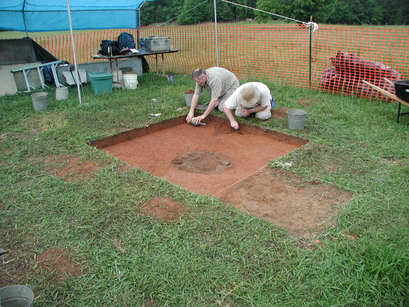Project co-director Brett Riggs and graduate supervisor Jon Marcoux are cleaning a 2x2-meter excavation that has exposed the top of Feature 1, a shallow circular pit. This feature contained portions of several Catawba-made pots.