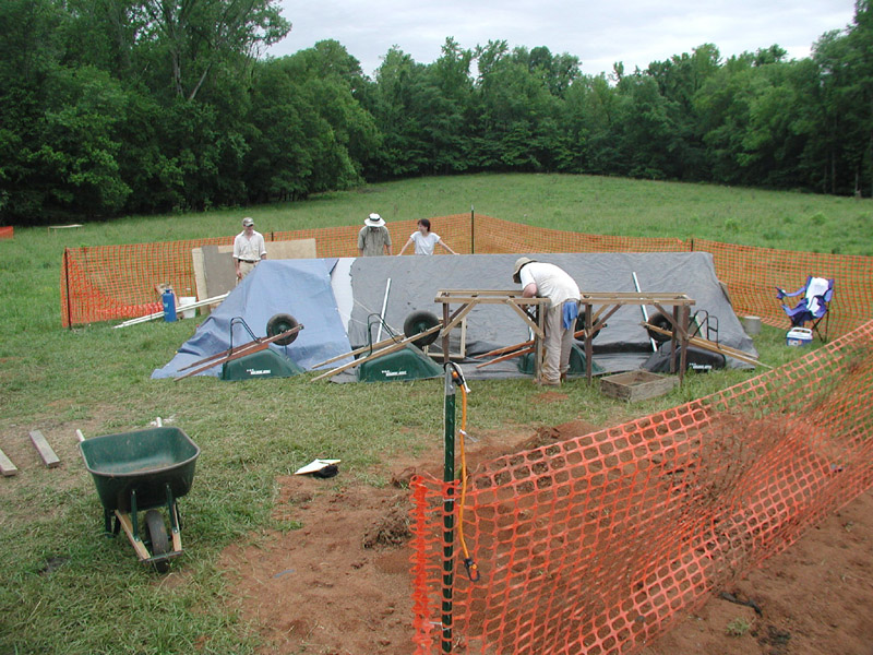 Students are covering up an excavated area at day's end, in anticipation of rain. Heavy rains plagued our excavations here, and at one point floodwaters from the nearby Catawba River submurged most of the pasture visible in the background