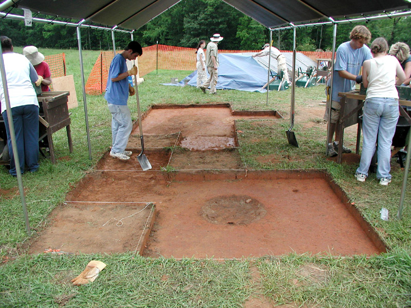 View of the expanded excavation block containing Features 1, 2, and 3. Feature 1 can be seen in the foreground. Work in this block is not yet completed.