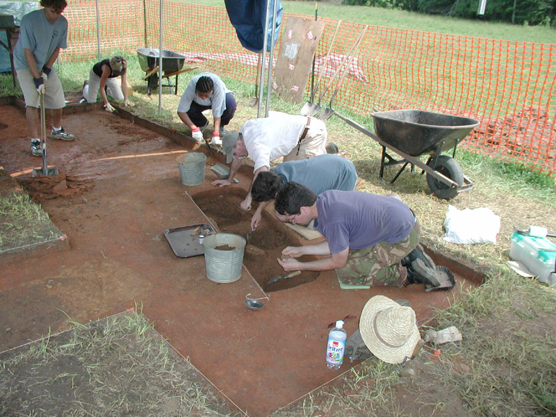 UNC graduate student Lance Greene (in foreground) and fellow students are excavating the south half of Feature 2, a rectangular cellar pit dating to the 1770s.