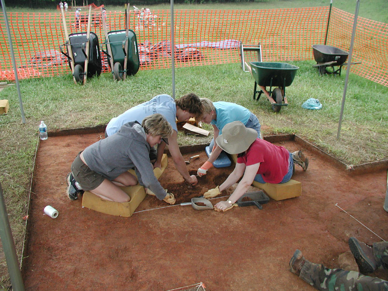 UNC fieldschool students Susan Simms, Chris Umphlett, Charlene Brummitt, and Ellen Sedman (from left to right) are beginning excavation into the top of Feature 4, a large, shallow, trash-filled pit.
